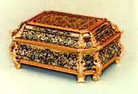 Some Boulle furniture includes inlays of ivory, coloured horn, pewter